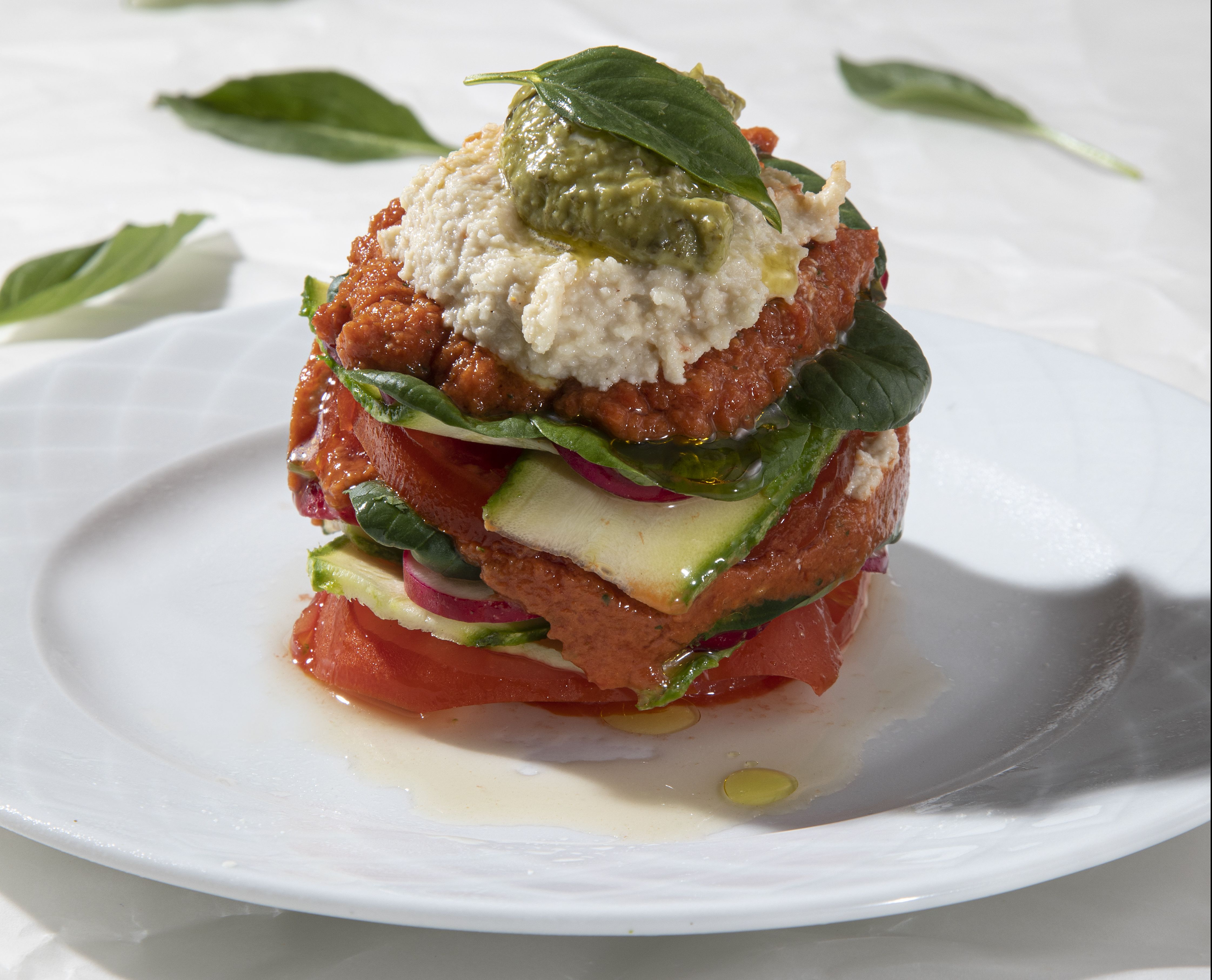 Χρησιμοποιούμε ένα στρογγυλό τσέρκι και στρώνουμε τις φέτες κολοκυθιού. Συνεχίζουμε με τα ραπανάκια, τις ντομάτες, το σπανάκι και τον βασιλικό. Βάζουμε την μισή σάλτσα ντομάτας, τη μισή σάλτσα τυριού και το μισό πέστο. Επαναλαμβάνουμε ξανά την ίδια διαδικασία ώστε να κάνουμε και άλλη μια στρώση. Βάζουμε για 15΄στο ψυγείο και σερβίρουμε.