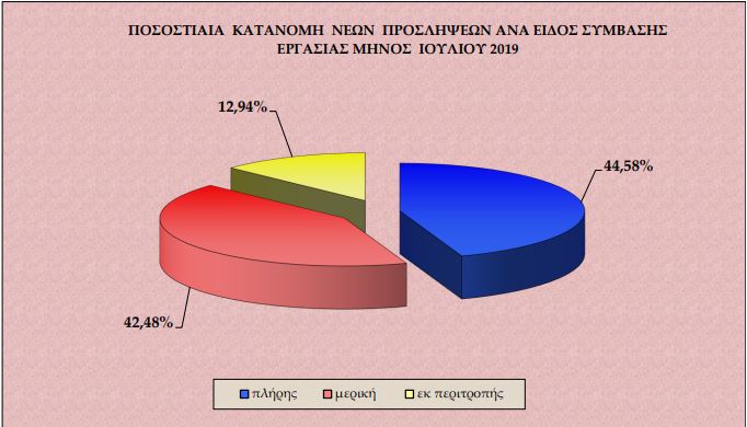 Αθροιστικά για την περίοδο Ιανουάριος – Ιούλιος 2019, οι αναγγελίες προσλήψεων ανήλθαν στις 1.669.921 θέσεις εργασίας και οι αποχωρήσεις έφτασαν τις 1.388.146, εκ των οποίων οι 817.006 ήταν αποτέλεσμα καταγγελιών συμβάσεων αορίστου χρόνου ή λήξεων συμβάσεων ορισμένου χρόνου και οι 571.140 οικειοθελείς αποχωρήσεις.