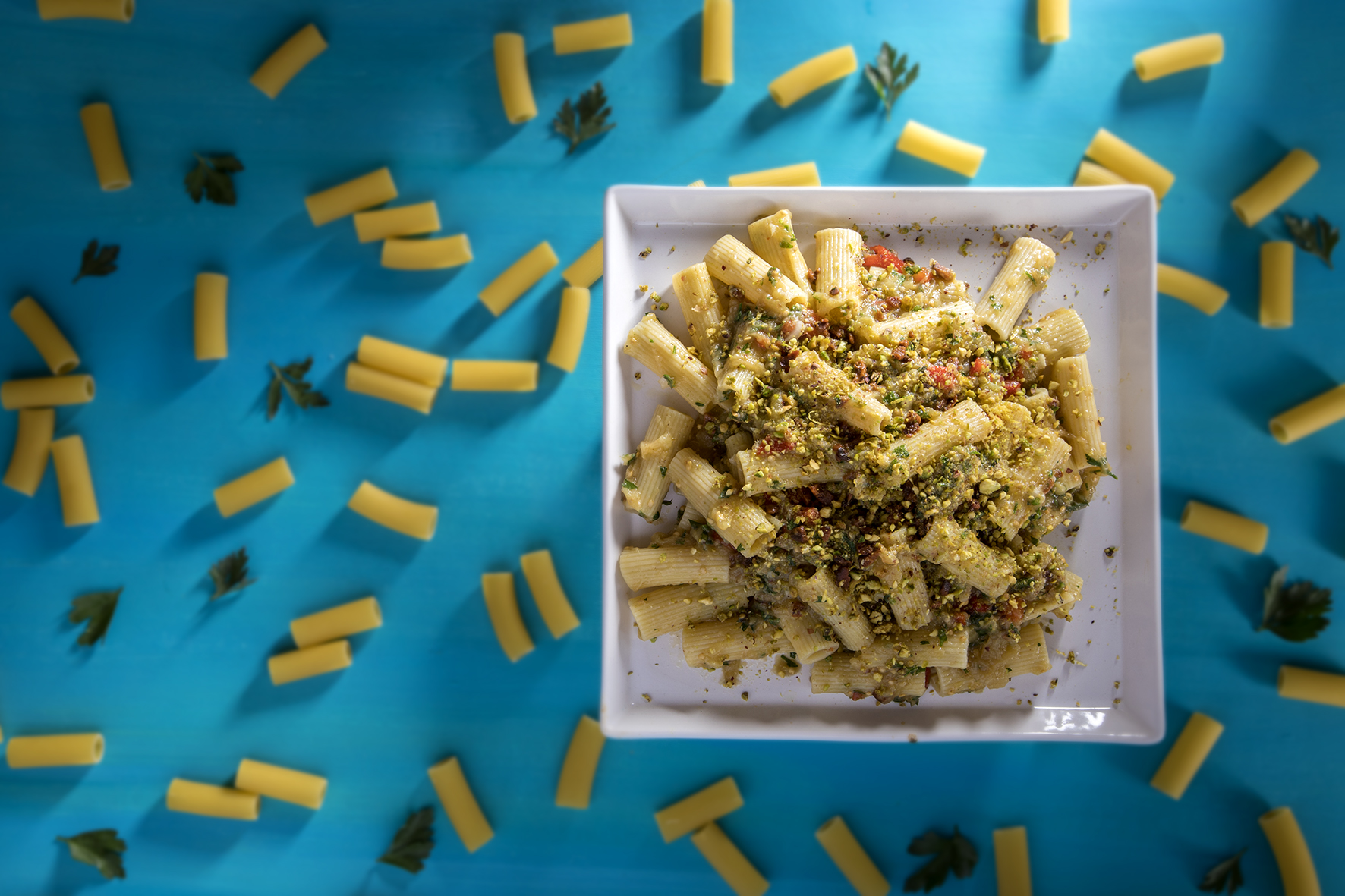 Χτυπάμε στο μούλτι το υπόλοιπο ελαιόλαδο με το μπαλσάμικο και τον πελτέ. Προσθέτουμε αλατοπίπερο. Ανακατεύουμε τα ζυμαρικά με το λαδόξιδο και προσθέτουμε τα λαχανικά, τον μαϊντανό και τις ελιές. Ανακατεύουμε καλά.