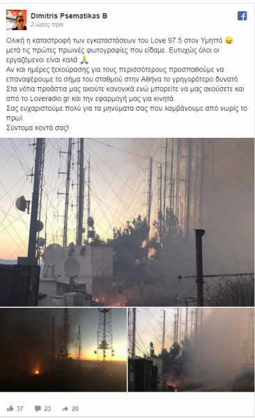 «Ολική η καταστροφή των εγκαταστάσεων του Love 97.5 στον Υμηττό, μετά τις πρώτες πρωινές φωτογραφίες που είδαμε. Ευτυχώς όλοι οι εργαζόμενοι είναι καλά» γράφει χαρακτηριστικά ενώ συμπληρώνει: «Αν και ημέρες ξεκούρασης για τους περισσότερους προσπαθούμε να επαναφέρουμε το σήμα του σταθμού στην Αθήνα το γρηγορότερο δυνατό».