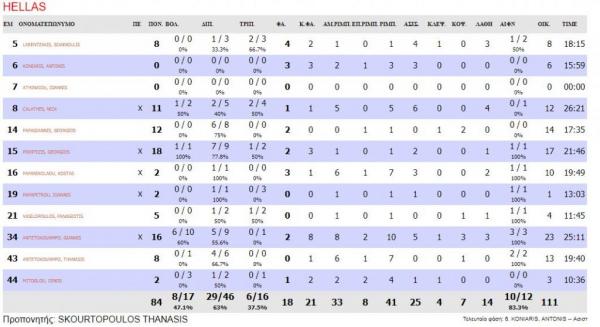 Ελλάδα (Σκουρτόπουλος): Λαρεντζάκης 8 (2), Κόνιαρης, Καλάθης 11 (2 τρ., 6 ασ.), Παπαγιάννης 12, Πρίντεζης 18 (1), Παπανικολάου 2 (7ριμπ.), Παπαπέτρου 2, Βασιλόπουλος 5 (1), Αντετοκούνμπο Γ. 16 (10ριμπ.), Αντετοκούνμπο Θ. 8, Μήτογλου 2