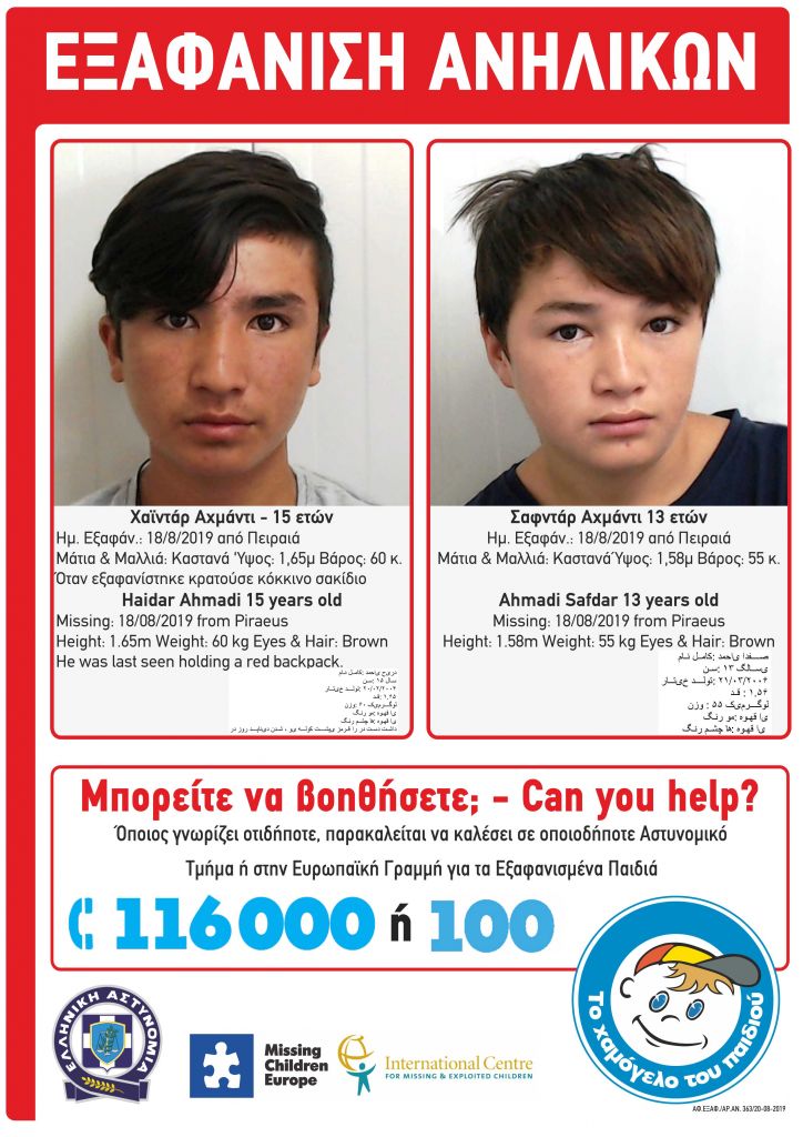 «Το Χαμόγελο του Παιδιού» ενημερώθηκε για την εξαφάνιση των ανηλίκων στις 19 Αυγούστου 2019 και προέβη σήμερα, 20 Αυγούστου 2019, στη δημοσιοποίηση των στοιχείων των ανηλίκων, κατόπιν εισαγγελικής εντολής.