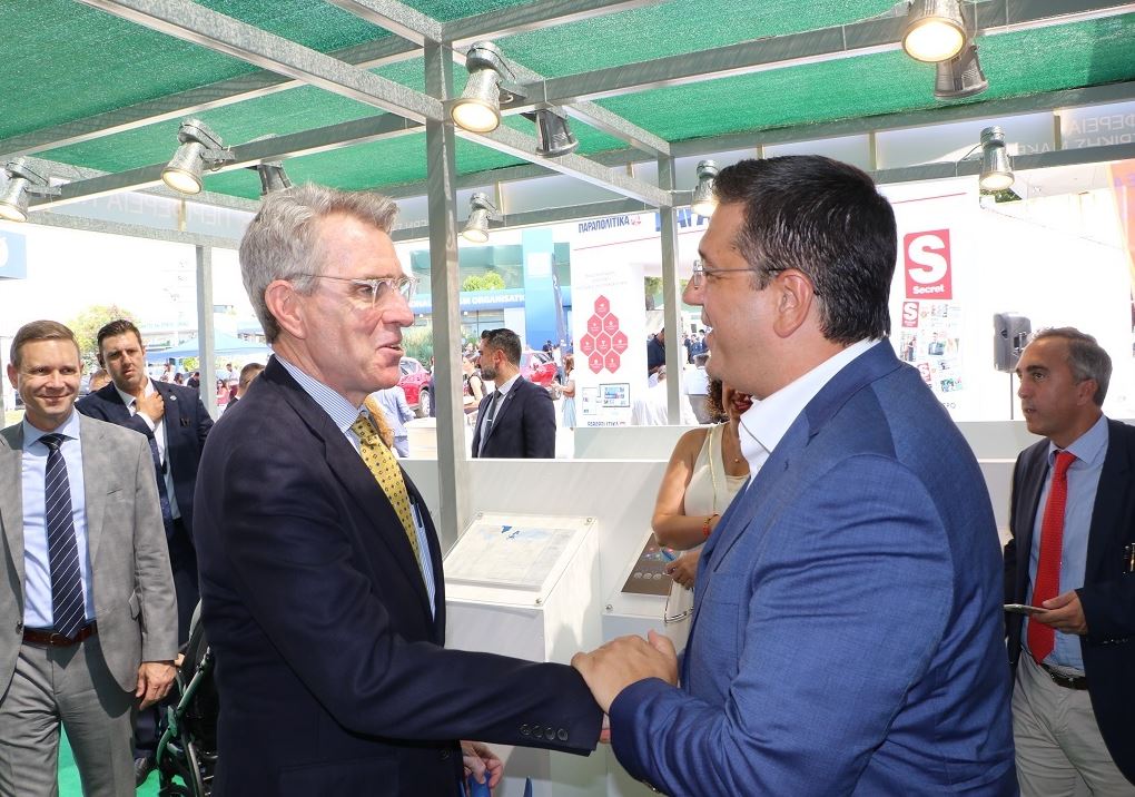 Στη συνέχεια, ο περιφερειάρχης Κεντρικής Μακεδονίας υποδέχθηκε στο περίπτερο της περιφέρειας τον πρέσβη των ΗΠΑ στην Ελλάδα, Τζέφρι Πάιατ.
