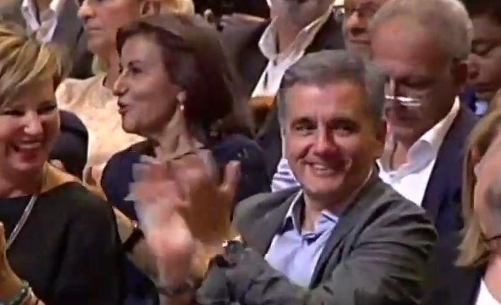 Στο σημείο αυτό, ο στενός συνεργάτης του και πρώην υπουργός Οικονομιών, Ευκλείδης Τσακαλώτος άρχισε να χειροκροτάει.