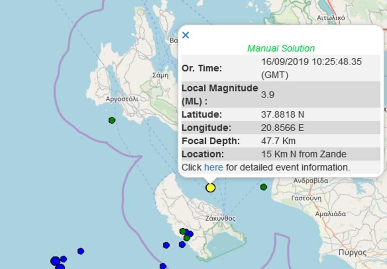 Σύμφωνα με το Γεωδυναμικό Ινστιτούτο, η δόνηση είχε μέγεθος 3,9 ρίχτερ, ενώ το επίκεντρο είναι 16 χλμ βόρεια της Ζακύνου και το εστιακό βάθος 47χιλιόμετρα.