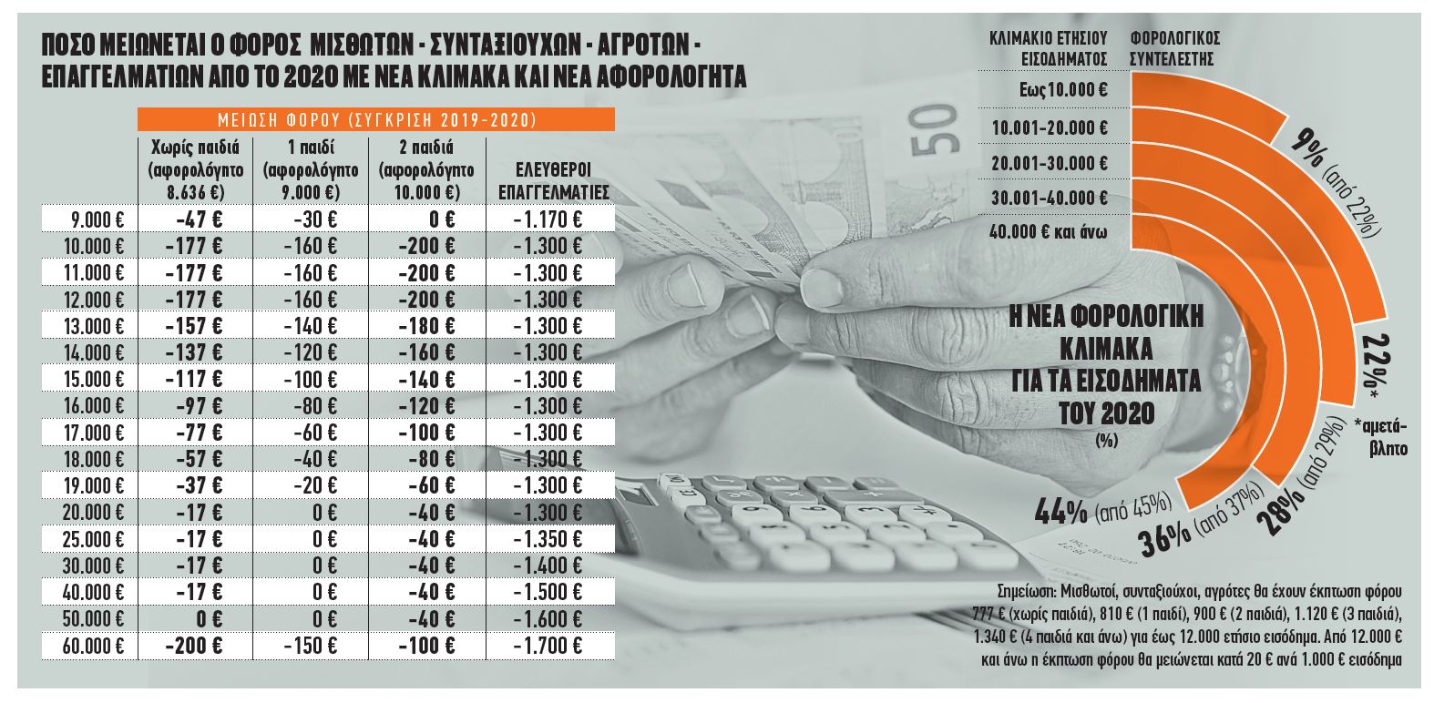 Οι μισθωτοί, οι αγρότες και οι συνταξιούχοι θα έχουν νέες εκπτώσεις φόρων, οι οποίες σε συνδυασμό με τις αλλαγές στους φορολογικούς συντελεστές θα οδηγήσουν σε μείωση φόρων για εισοδήματα έως 12.000 ευρώ, σε μικρότερη μείωση φόρων για εισοδήματα από 12.000 ευρώ έως 20.000 ευρώ και από εκεί και πάνω, αν πρόκειται για άγαμο ή έγγαμο χωρίς παιδιά, το ετήσιο όφελος θα είναι 17 ευρώ αν το εισόδημα φτάνει έως 50.000 ευρώ ετησίως. Στην περίπτωση του φορολογουμένου με 1 προστατευόμενο τέκνο προκύπτει μείωση της φορολογίας έως τα 20.000 ευρώ και από 20.001 ευρώ έως 50.000 ευρώ η διαφορά του φόρου μεταξύ εισοδημάτων που θα αποκτηθούν το 2020 σε σύγκριση με το 2019 είναι 0 ευρώ. Γενναία μείωση του φόρου θα δει ο συγκεκριμένος φορολογούμενος εφόσον τα ετήσια δηλωθέντα εισοδήματά του ξεπερνούν τα 50.000 ευρώ.