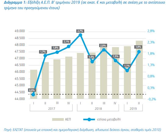 Σύµφωνα µε τις πρώτες εκτιµήσεις της ΕΛΣΤΑΤ, η αύξηση του ΑΕΠ επιταχύνθηκε µε ρυθµό 1,9% το B’ τρίµηνο του 2019 έναντι του αντιστοίχου τριµήνου του 2018· όπως και έναντι του Α’ τριµήνου οπότε η αύξηση είχε περιοριστεί στο 1,1%.
