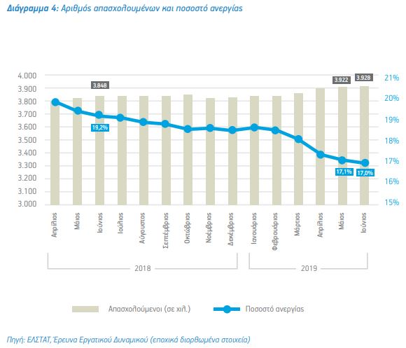Συγκεκριµένα, τον Ιούνιο του 2019 το εποχικά διορθωµένο ποσοστό ανεργίας περιορίστηκε σε 17% έναντι 17,1% του προηγούµενου µήνα και 19,2% του Ιουνίου του 2018.