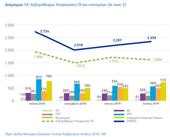Τον Ιούλιο του 2019, οι συνολικές ληξιπρόθεσµες υποχρεώσεις (συµπεριλαµβανοµένων των εκκρεµών επιστροφών φόρων) ανήλθαν σε 2,359 δισ ευρώ έναντι 2,724 δισ ευρώ κατά την αντίστοιχη περίοδο του 2018.