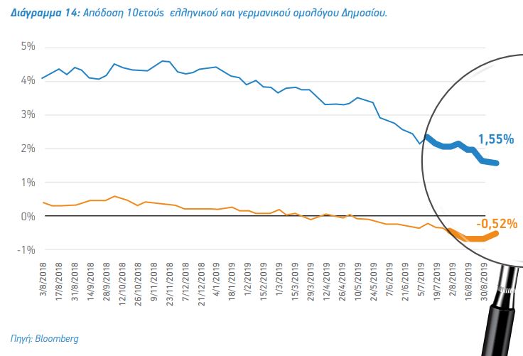 Έμφαση δίνεται δε και στην σημαντική μείωση -σε ιστορικά χαμηλά- της απόδοση του 10ετούς ομολόγου.