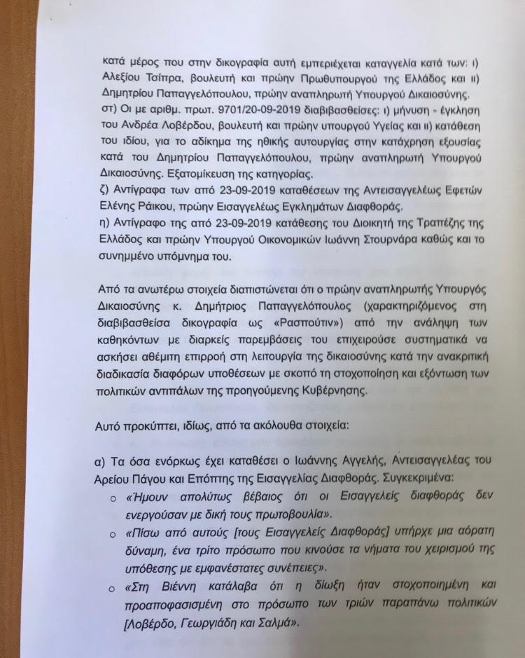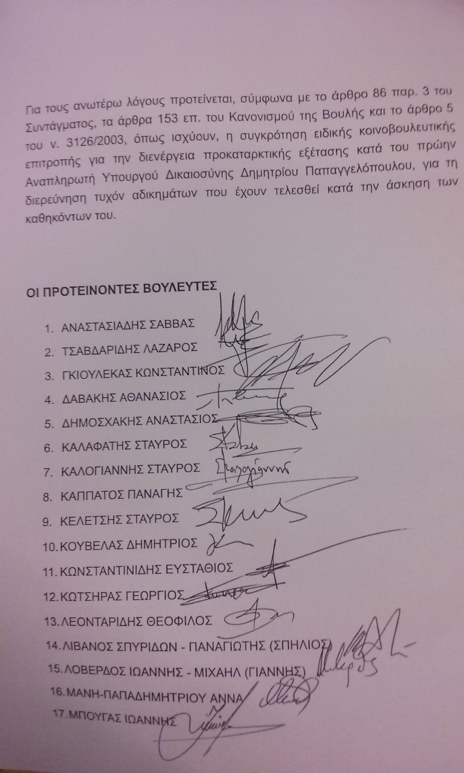 Σύμφωνα με τη πρόταση των βουλευτών αναφέρουν ότι με βάση τις καταθέσεις των κ.κ. Λοβέρδου, Στουρνάρα και Ράικου ο Δήμητρης Παπαγγελόπουλος – χαρακτηριζόμενος ως Ρασπούτιν – από την ανάληψη των καθηκόντων του με διαρκείς παρεμβάσειος του επιχειρούσε συστηματικά να ασκήσει αθέμιτη επιρροή στη λειτουργία της δικαιοσύνης.