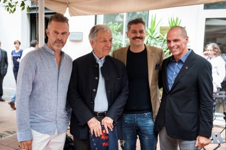 Ο σκηνοθέτης Κώστας Γαβράς με τον συγγραφέα Γιάνη Βαρουφάκη και τους πρωταγωνιστές της ταινίας Χρήστο Λούλη και Αλέξανδρο Μπουρδούμη (φωτό Θάλεια Γαλανοπούλου)