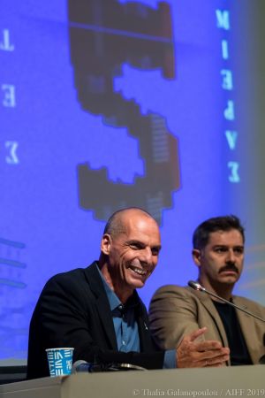 Από το πάνελ των ομιλητών δεν έλειψε ο πρώην υπουργός Οικονομικών και αρχηγός του κόμματος ΜΕΡΑ 25 κ. Γιάνης Βαρουφάκης, ο οποίος διευκρίνισε ότι «βρίσκομαι εδώ με την ιδιότητα του συγγραφέα και μόνον». Φυσικό καθότι στο δικό του βιβλίο, το μπεστ σέλερ στο εξωτερικό «Ανίκητοι ηττημένοι», είναι βασισμένο το σενάριο της ταινίας «Ενήλικοι στην αίθουσα».