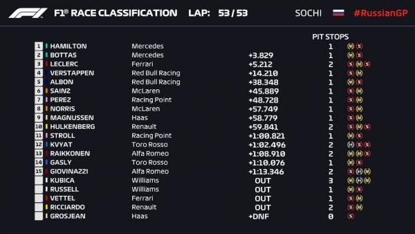 Ο Λεκλέρκ μπήκε ξανά στα πιτς για να βάλει τη μαλακή γόμα και ξαναβγήκε 3ος θέλοντας να πιέσει. Ο Μπότας έπαιξε «καλή άμυνα», ο Χάμιλτον ξεμάκρυνε και πήρε μία εύκολη νίκη.