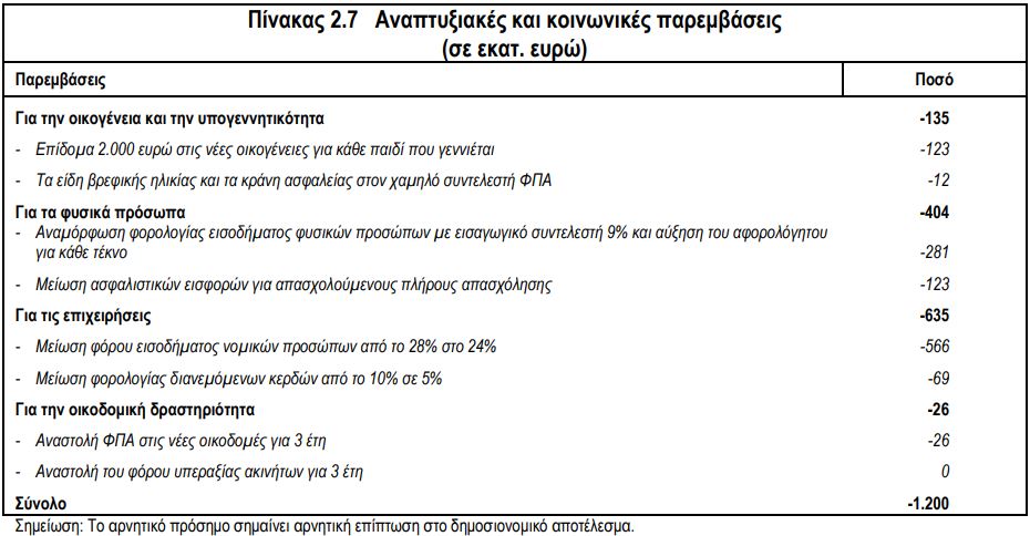 Οι επεκτατικές παρεμβάσεις αφορούν κυρίως στη μείωση της φορολογίας νομικών προσώπων (635 εκατ.), φυσικών προσώπων (281 εκατ.) και ασφαλιστικών εισφορών (123 εκατ.).