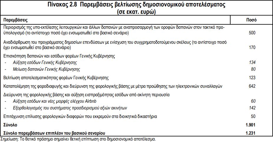 Ειδικότερα, όπως επισημαίνεται στην γνώμη του ΓΠΚΒ, η φορολογία ακίνητης περιουσίας (202 εκατ.) παρουσιάζει «υψηλή βεβαιότητα», ενώ η μείωση της οροφής δαπανών (500 εκατ.), η επισκόπηση δαπανών (80 εκατ.), εσόδων (134 εκατ.), η βελτίωση αποτελεσματικότητας των φορέων γενικής κυβέρνησης (123 εκατ.) και η προώθηση των ηλεκτρονικών συναλλαγών (642 εκατ.) έχουν λιγότερο εξασφαλισμένη απόδοση.