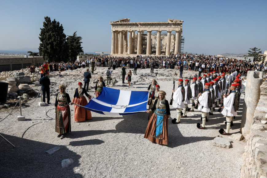 Εβδομήντα πέντε χρόνια πέρασαν από την απελευθέρωση της Αθήνας και ο Ιερός Βράχος της Ακρόπολης γέμισε με Εύζωνες της Προεδρικής Φρουράς για την έπαρση της σημαίας.