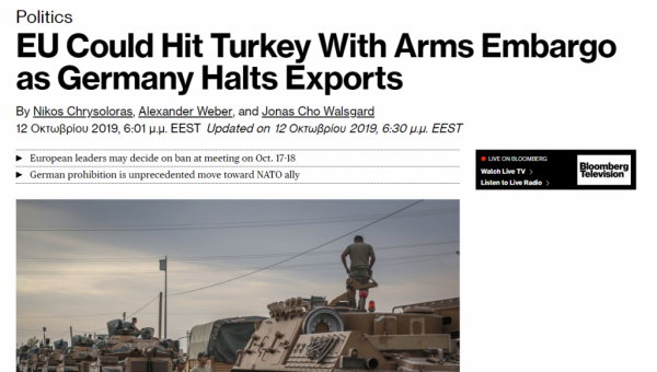 Υπενθυμίζεται πως από το Σάββατο η Γαλλία και η Γερμανία ανακοίνωσαν τη διακοπή εξαγωγής όπλων στην Τουρκία. Το ίδιο έπραξαν στη συνέχεια άλλες τρεις χώρες: η Ολλανδία, η Νορβηγία, η Φινλανδία.