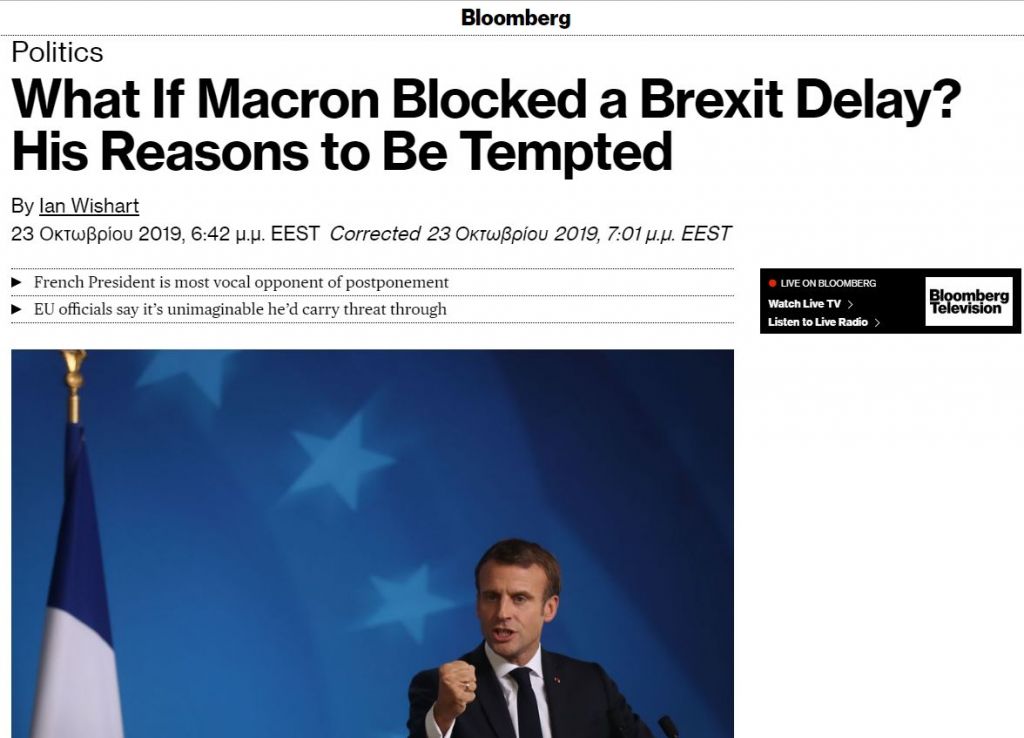 Όπως αναφέρει χαρακτηριστικά το Bloomberg, οποιαδήποτε αναβολή του Brexit απαιτεί την ομόφωνη υποστήριξη των ηγετών της ΕΕ και ο κάτοικος του Ελιζέ έχει την εξουσία να… υπαγορεύει το μέλλον της Βρετανίας.