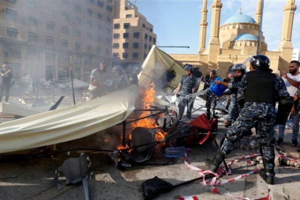 Στο κέντρο της Βηρυτού, μαυροντυμένοι άνδρες κραδαίνοντας ραβδιά και σωλήνες κατέστρεψαν έναν καταυλισμό αντικυβερνητικών διαδηλωτών που ήταν το σημείο όπου συνέκλιναν οι διαδηλώσεις που πραγματοποιούνται σε όλη τη χώρα εναντίον μιας πολιτικής ελίτ που κατηγορείται για ασύστολη διαφθορά και ώθηση του Λιβάνου προς την οικονομική κατάρρευση.