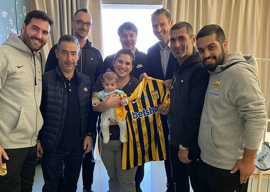 «Η ΠΑΕ ΑΡΗΣ δίπλα στον μικρό Παναγιώτη-Γερβάσιο. Αντιπροσωπεία της ομάδας μας επισκέφτηκε σήμερα το πρωί το μικρό ΑΡΕΙΑΝΑΚΙ, που νοσηλεύεται στο Ωνάσειο Καρδιοχειρουρχικό Κέντρο και ο Διευθυντής του Ποδοσφαιρικού Τμήματος, Άγγελος Χαριστέας, έδωσε μια φανέλα με τις υπογραφές των ποδοσφαιριστών της ομάδας μας και με τις ευχές όλων μας να συνοδεύουν τον μικρό Παναγιώτη-Γερβάσιο».