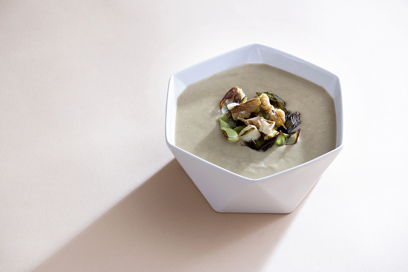 Γαρνίρισμα: Βάζουμε ένα τηγάνι σε μέτρια προς δυνατή φωτιά. Σοτάρουμε στο λάδι το πράσο να πάρει χρώμα. Προσθέτουμε το σιρόπι σφενδάμου. Αλατοπιπερώνουμε και ανακατεύουμε μέσα και τα χοντροκομμένα καρύδια. Αποσύρουμε από τη φωτιά. Σερβίρουμε τη σούπα με το σοταρισμένο γαρνίρισμα από πάνω.