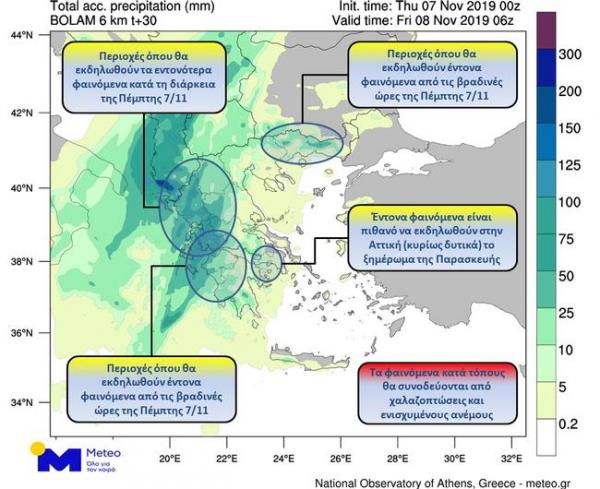 - Από το απόγευμα της σημερινής ημέρας (Πέμπτη 07-11-2019), εκτός από το βόρειο Ιόνιο και την Ήπειρο αναμένεται να επηρεαστεί η δυτική Στερεά και μέχρι τη νύχτα τα υπόλοιπα τμήματα του Ιονίου και η δυτική Πελοπόννησος. Από το μεσημέρι της Παρασκευής (08-11-2019) τα φαινόμενα στις παραπάνω περιοχές θα εξασθενήσουν.