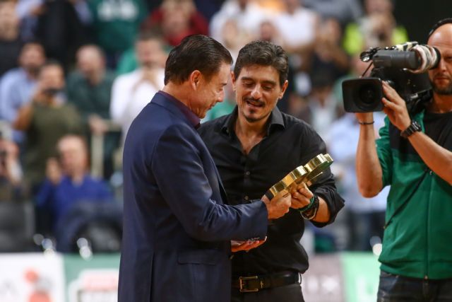 Ο Πιτίνο κατέβηκε στο παρκέ προκειμένου να βραβευτεί από τον μεγαλομέτοχο της ΚΑΕ, Δημήτρη Γιαννακόπουλο, με τον κόσμο να ξεσπά στο γνωστό πλέον «Ρικ Πιτίνο, οε, οε, οε».