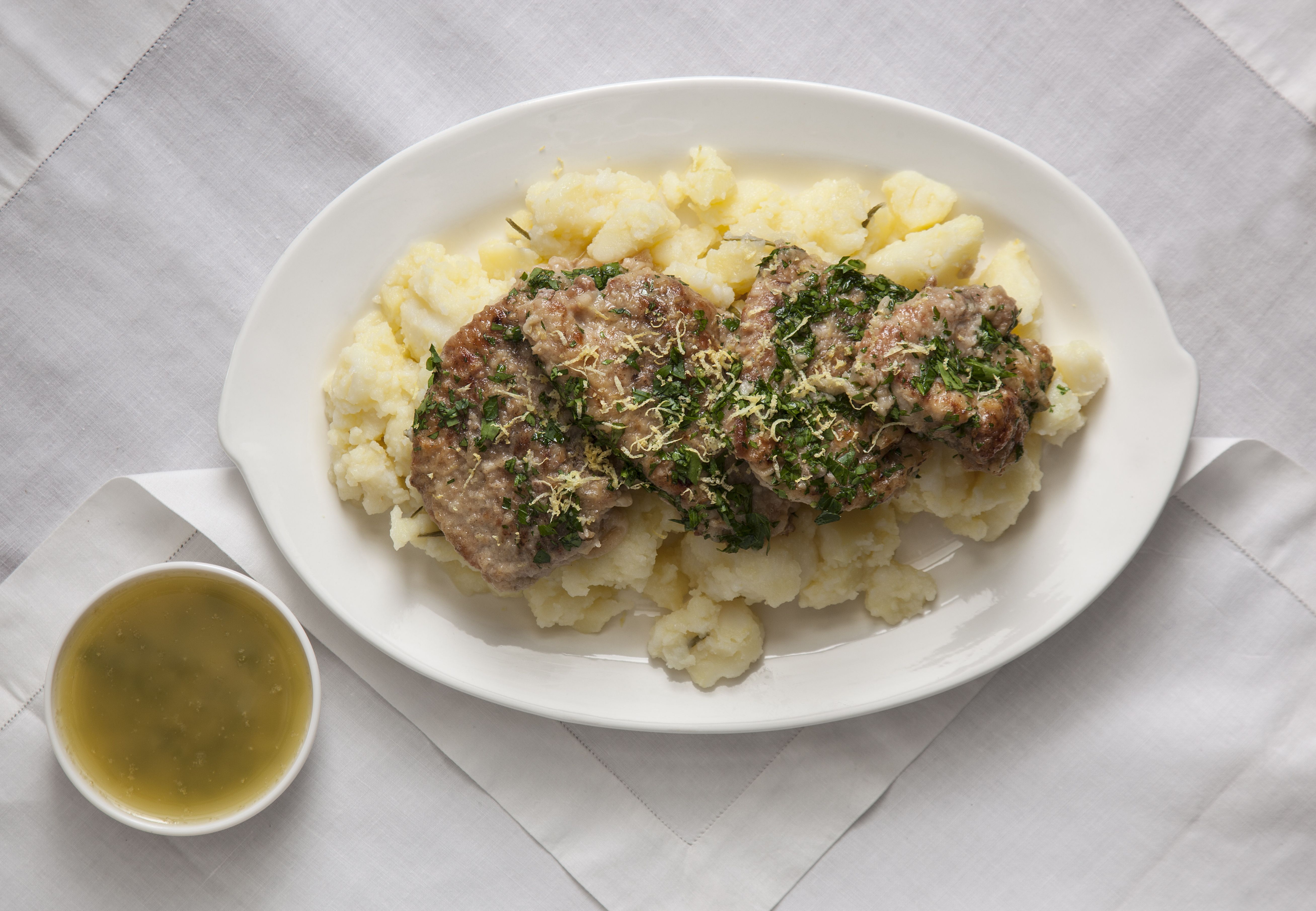 Σερβίρουμε στο κέντρο κάθε πιάτου τις πατάτες, τοποθετούμε από πάνω δύο σκαλοπίνια, περιχύνουμε με σάλτσα, τρίβουμε λίγο φρέσκο πιπέρι και διακοσμούμε με μερικά φύλλα μαϊντανό.