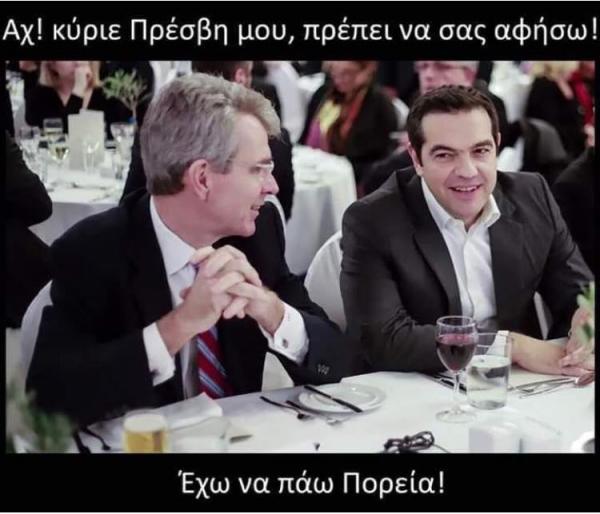 “Ο αρχηγός της Αξ. Αντιπολίτευσης κος Τσίπρας θα τεθεί επικεφαλής του ΣΥΡΙΖΑ στην πορεία για το Πολυτεχνείο με τον συναγωνιστή & σύντροφο του κο Καμμένο, ενώ μετά την άφιξη της πορείας στην Αμερικάνικη Πρεσβεία θα έχει συνάντηση με τον φίλο του κο Πρέσβη.”