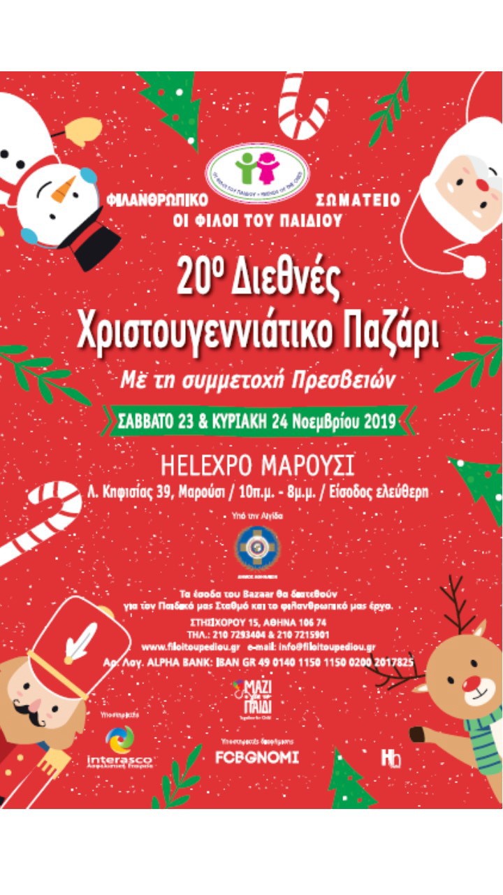 Το Φιλανθρωπικό Σωματείο «Οι Φίλοι του Παιδιού» με μεγάλη χαρά σας προσκαλεί, για ακόμη μια χρονιά στο 20ο Διεθνές Χριστουγεννιάτικο Bazaar, που θα πραγματοποιηθεί το Σάββατο 23 και την Κυριακή 24 Νοεμβρίου 2019.