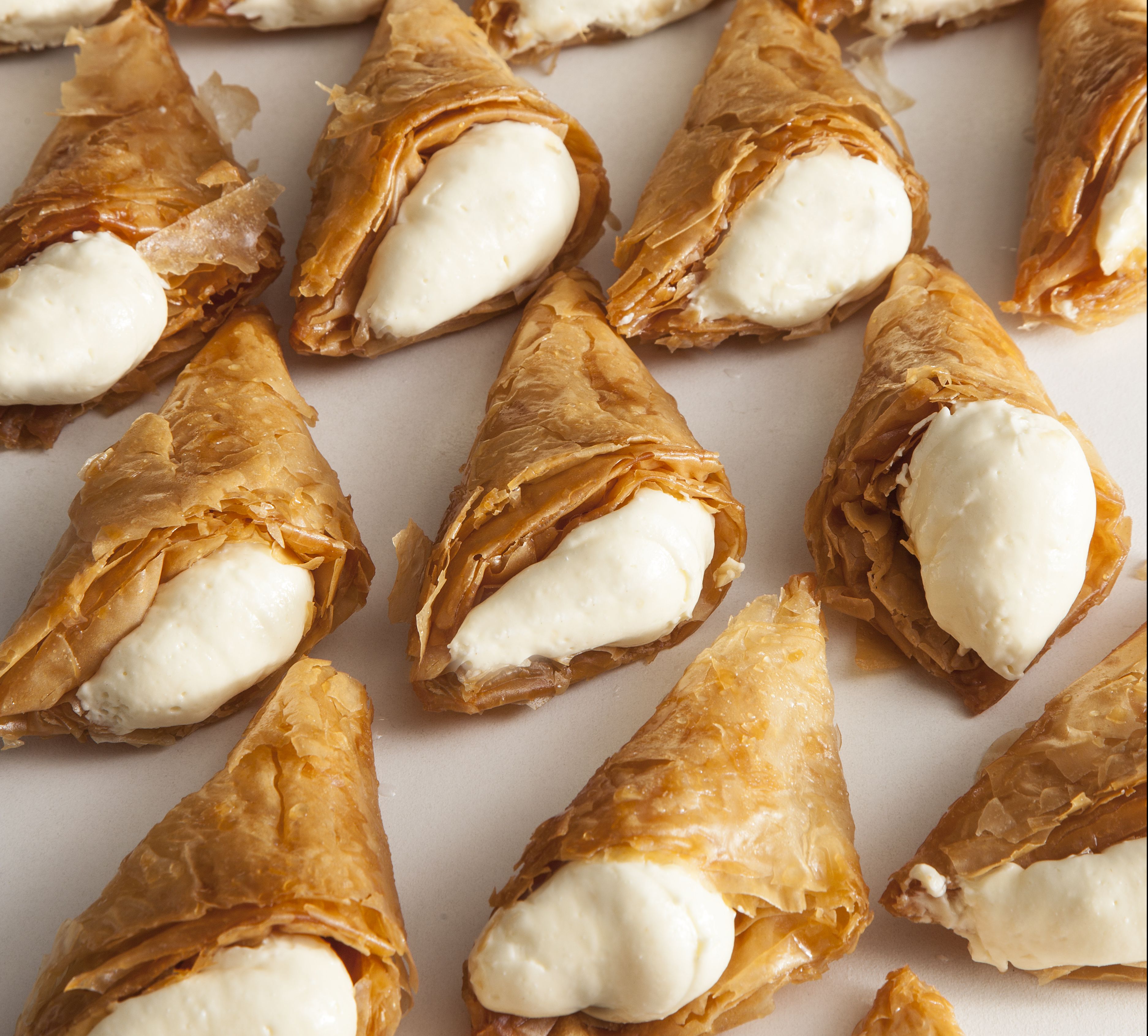 Βάζουμε την κρέμα σε κορνέ και γεμίζουμε τα τρίγωνα. Αν θέλουμε, πασπαλίζουμε την κρέμα με τριμμένο αμύγδαλο ή φιστίκι.