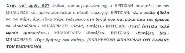 Εκεί βρήκε τιμολόγια που αφορούσαν τόσο τον Μηλιωρίδη όσο και έναν εκ των φερόμενων ως δραστών του εμπρησμού του αυτοκινήτου της συζύγου του Ευαγγελόπουλου.