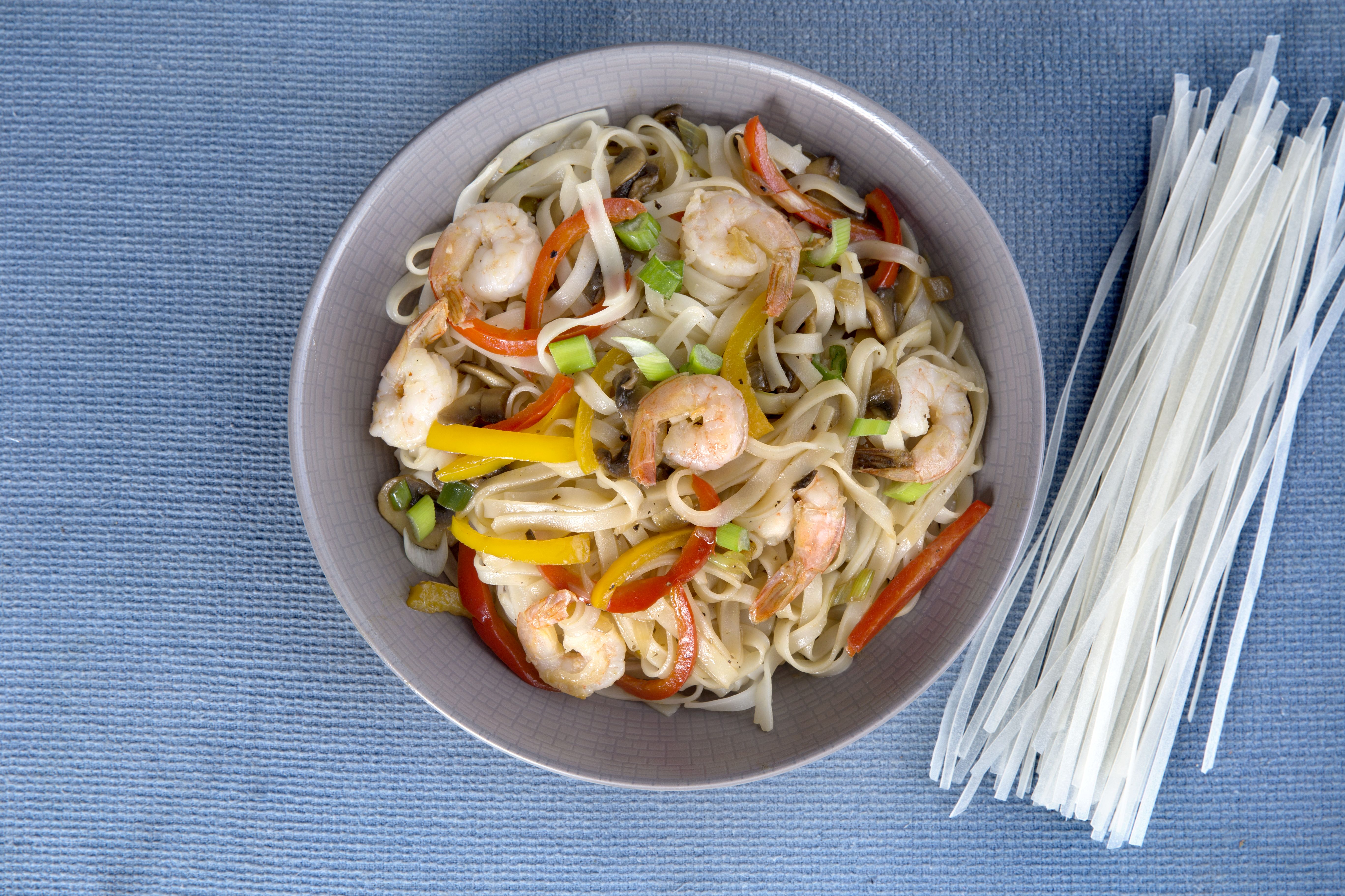 Βράζουμε νερό σε μια μικρή κατσαρόλα και σβήνουμε τη φωτιά. Ρίχνουμε τα νουντλς και τα αφήνουμε για 5 λεπτά. Ρίχνουμε ελάχιστο ελαιόλαδο σε αντικολλητική κατσαρόλα και σοτάρουμε, σε μέτρια προς δυνατή φωτιά τα κρεμμύδια, τα μανιτάρια, τις πιπεριές και το σκόρδο. Μόλις μαλακώσουν, προσθέτουμε τις γαρίδες και συνεχίζουμε για 1 – 2 λεπτά. Σβήνουμε με τη σάλτσα σόγιας και προσθέτουμε τα νουντλς με ελάχιστο από το νερό τους. Ανακατεύουμε για 2 λεπτά. Ρίχνουμε φρεσκοτριμμένο πιπέρι και σερβίρουμε.
