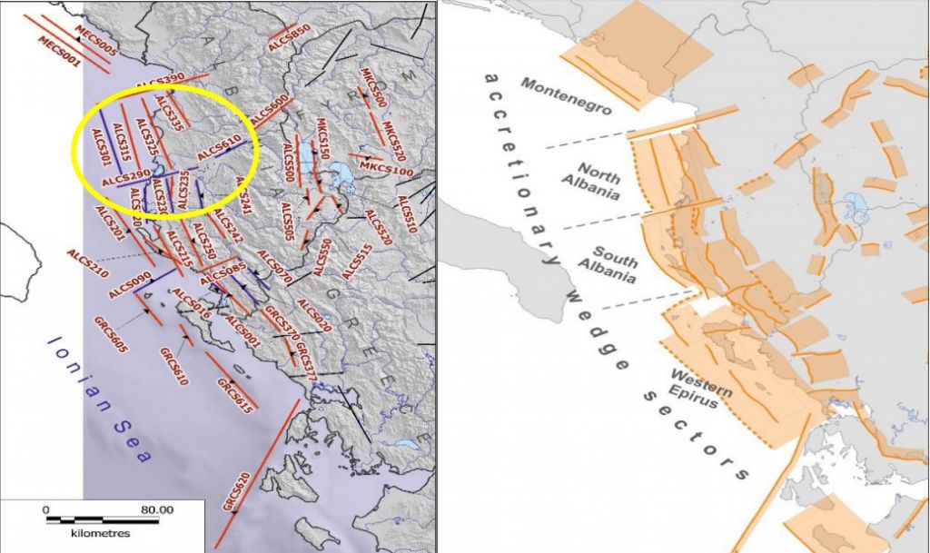 σ.σ. Λεζάντα συνημμένου χάρτη: Αριστερά τα ενεργά ρήγματα Αλβανίας και Δυτικής Ελλάδος, ως σεισμογενετικές πηγές, ως γραμμικά στοιχεία και δεξιά ως «επίπεδα» (ζώνες). Το Ανάστροφο Ρήγμα Δυρραχίου (Dures) με κωδικό ALCS301 και το αντιθετικό του ALCS 325, όπως προκύπτει από τα πρώτα σεισμολογικά δεδομένα ενεργοποιήθηκαν στον πρόσφατο σεισμό, καθώς επίσης και άλλα μικρότερα ρήγματα της ίδιας γεωτεκτονικής δομής.