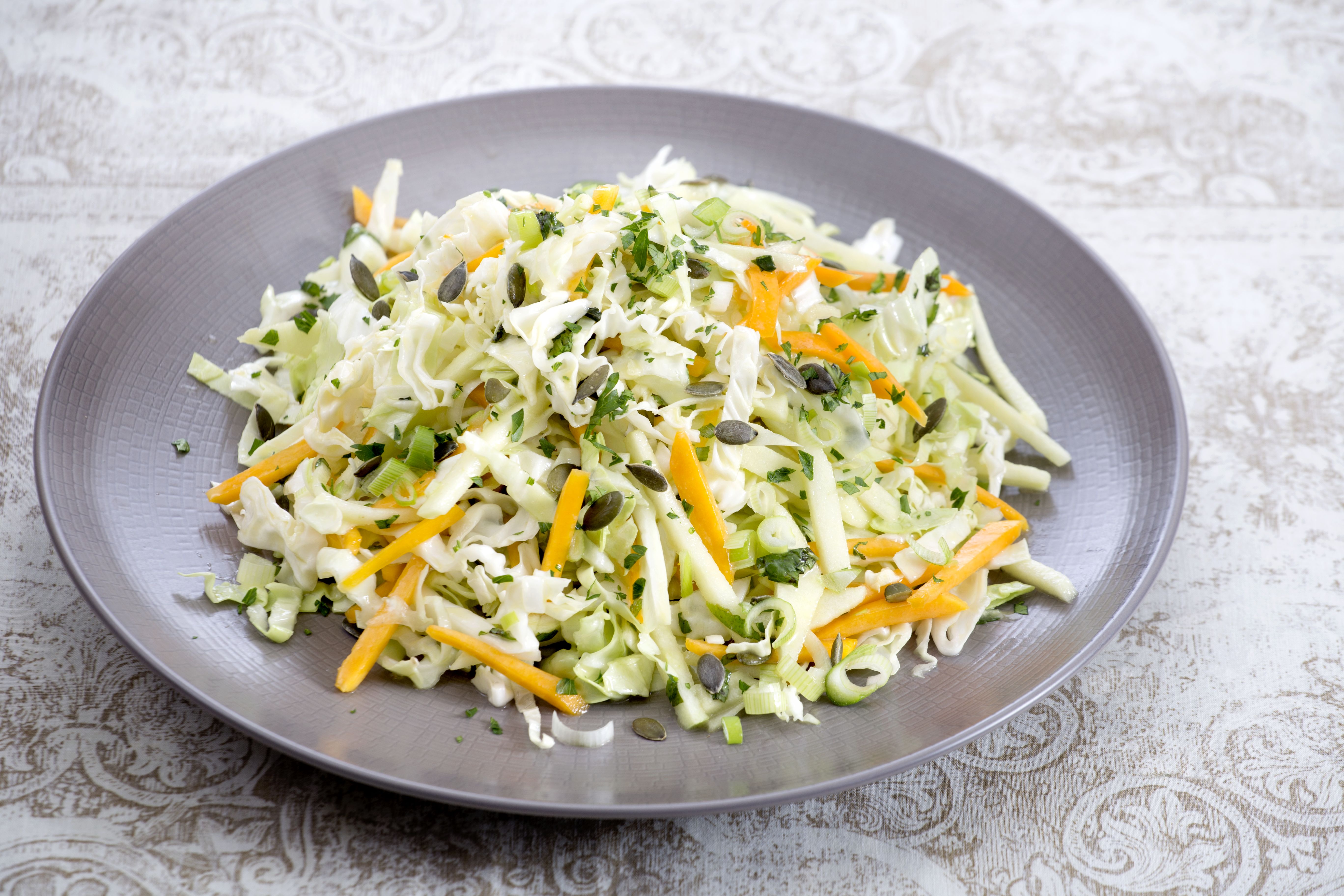 Κόβουμε σε λεπτές λωρίδες το λάχανο, την κολοκύθα, τα ξινόμηλα και το κρεμμυδάκι. Τα βάζουμε σε μεγάλη σαλατιέρα και προσθέτουμε τα φύλλα δυόσμου, κρατώντας λίγα για το τέλος. Αλατίζουμε και αφήνουμε στην άκρη για λίγα λεπτά, ώστε να μαλακώσουν τα υλικά.