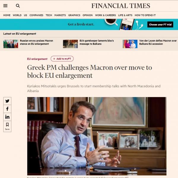 Αιχμές για τη στάση του γάλλου προέδρου Εμανουέλ Μακρόν σχετικά με την εμπλοκή στις ενταξιακές διαπραγματεύσεις με την Β. Μακεδονία και την Αλβανία, καθώς και για τις δηλώσεις του σχετικά με το ΝΑΤΟ άφησε ο Κυριάκος Μητσοτάκης σε συνέντευξή του στους Financial Times την Τρίτη.