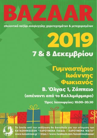 Το παζάρι μεταχειρισμένων ειδών και χειροτεχνημάτων που διοργανώνουν κάθε χρονιά από το 2011 οι εθελοντές των Κατασκηνώσεων “Χαρούμενα Παιδιά – Χαρούμενα Νιάτα”, θα διεξαχθεί και φέτος, το Σάββατο 7 και την Κυριακή 8 Δεκεμβρίου 2019, στο Κλειστό Γυμναστήριο «Ιωάννης Φωκιανός», Βασ. Όλγας 1, απέναντι από το Καλλιμάρμαρο στάδιο.
