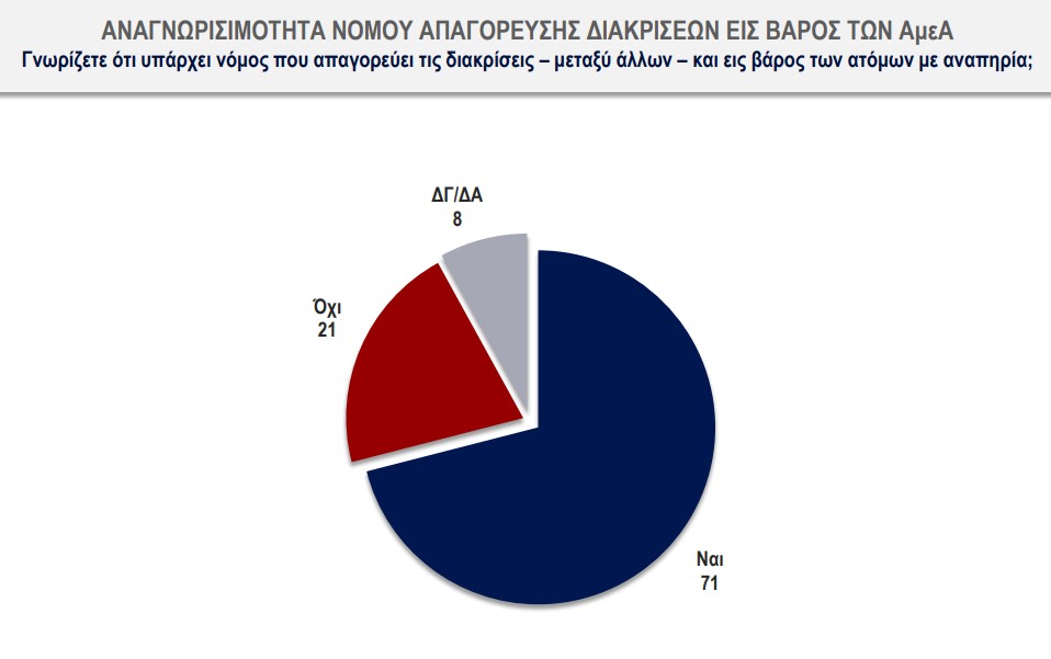 Το 71% των ερωτηθέντων γνωρίζει ότι υπάρχει νόμος που απαγορεύει τις διακρίσεις εις βάρος των ατόμων με αναπηρία, ενώ «όχι» απαντά ένα 21%. Υπέρ της λήψης μέτρων για την κοινωνική ένταξη των ΑμΕΑ τάσσεται το 87% των ανθρώπων που συμμετείχαν στην έρευνα.