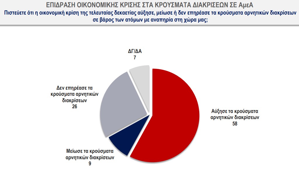 Επίσης, στην ερώτηση για το αν η οικονομική κρίση αύξησε τα κρούσματα αρνητικών διακρίσεων σε βάρος των ατόμων με αναπηρία, η πλειονότητα, ήτοι το 58%, απαντά θετικά, ενώ το 26% απαντά αρνητικά.