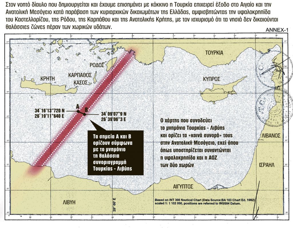 Ταυτόχρονα το δημοσίευμα επισημαίνει ότι «οι συντεταγμένες που καθορίζουν τα όρια της υφαλοκρηπίδας και της ΑΟΖ ανάμεσα σε Τουρκία και Λιβύη βασίζονται στην αυθαίρετη θέση της Άγκυρας ότι τα νησιά δεν δικαιούνται θαλάσσιες ζώνες, που επίσης αντιβαίνει τα όσα προβλέπονται στο Δίκαιο της Θάλασσας».