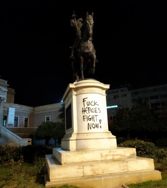 Νωρίτερα, περνώντας μπροστά από την Παλιά Βουλή, άγνωστοι έγραψαν με σπρέι συνθήματα στο άγαλμα του Κολοκοτρώνη.