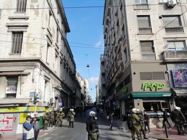 Η πορεία πέρασε από την πλατεία Κλαυθμώνος με το πλήθος να φωνάζει συνθήματα στη μνήμη του Αλέξανδρου Γρηγορόπουλου, όπως «Αυτές οι μέρες είναι του Αλέξη» και τις διμοιρίες των ΜΑΤ να τους ακολουθούν και από τις δύο πλευρές.