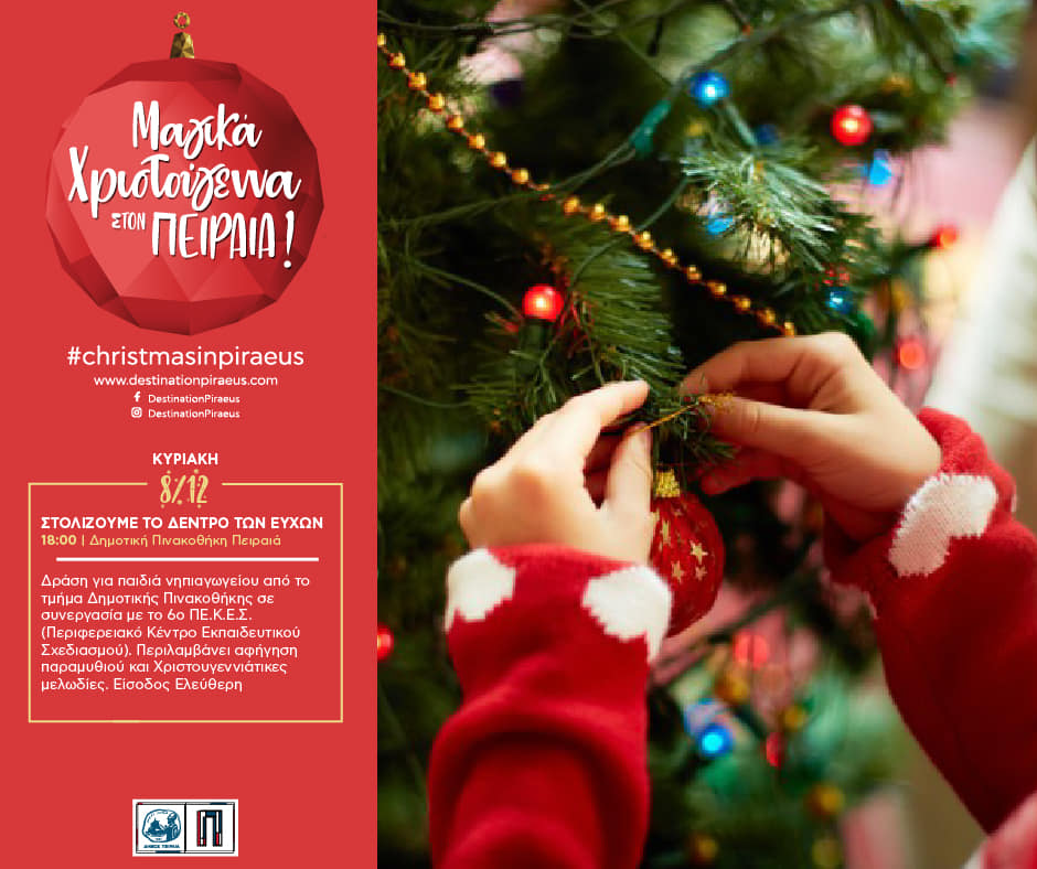 Η χριστουγεννιάτικη δράση για παιδιά νηπιαγωγείου «Στολίζουμε το δέντρο των ευχών», θα πραγματοποιηθεί αύριο Κυριακή 8 Δεκεμβρίου, στις 18:00, στη Δημοτική Πινακοθήκη Πειραιά, στο πλαίσιο των εορταστικών εκδηλώσεων του Δήμου Πειραιά.