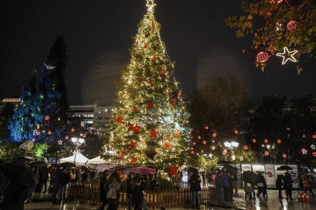 Υπό βροχή έγινε η φωταγώγηση του χριστουγεννιάτικου δέντρου στην πλατεία Συντάγματος, το βράδυ της Τρίτης.