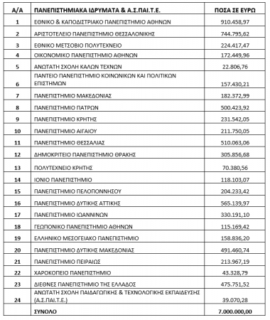 Υπεγράφη σήμερα από την Υπουργό Παιδείας και Θρησκευμάτων, κυρία Νίκη Κεραμέως, η απόφαση με την οποία κατανέμεται το ποσό των 7 εκατομμυρίων ευρώ στα Πανεπιστήμια και στην ΑΣΠΑΙΤΕ, βάσει συγκεκριμένων κριτηρίων.