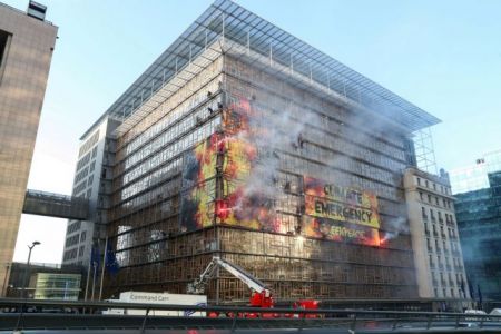 Στις… «φλόγες» τυλίχθηκε το κτίριο του Ευρωπαϊκού Συμβουλίου στις Βρυξέλλες το πρωί της Πέμπτης, ως μήνυμα για την κλιματική αλλαγή.