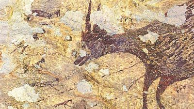 To παλαιότερο έργο τέχνης στον κόσμο, ηλικίας 43.900 ετών, υποστηρίζουν ότι ανακάλυψαν επιστήμονες σε σπήλαιο της Ινδονησίας. Πρόκειται για μια μονόχρωμη βραχογραφία σε τόνους του κόκκινου που απεικονίζει μια σκηνή κυνηγιού.