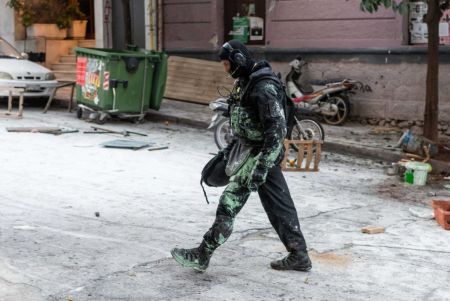 4. Στην ταράτσα, χρησιμοποιούμε πέτρες, μπογιά, πυροσβεστήρες στους μπάτσους