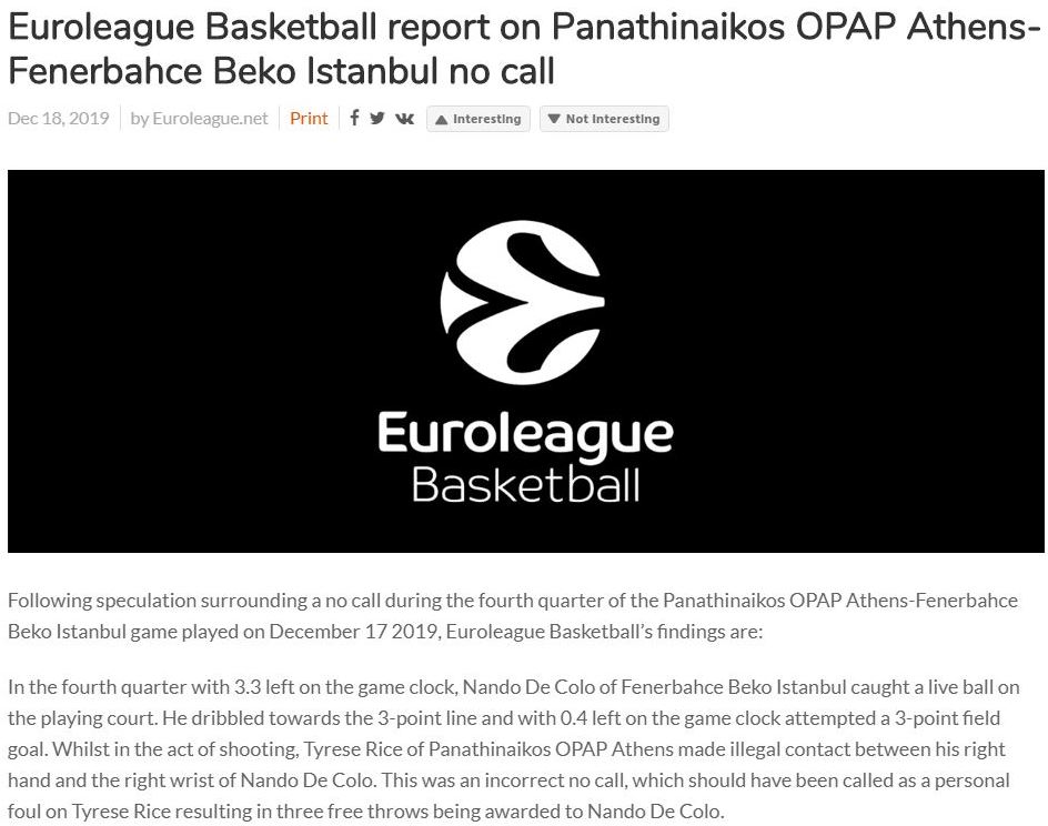 Η Euroleague μάλιστα με χαρακτηριστική ανακοίνωση πήρε θέση επί του θέματος και παραδέχτηκε ότι κακώς δεν σφυρίχτηκε φάουλ του Ράις πάνω στον Νάντο Ντε Κολό στην τελευταία φάση του αγώνα που ουσιαστικά έκρινε τον νικητή.